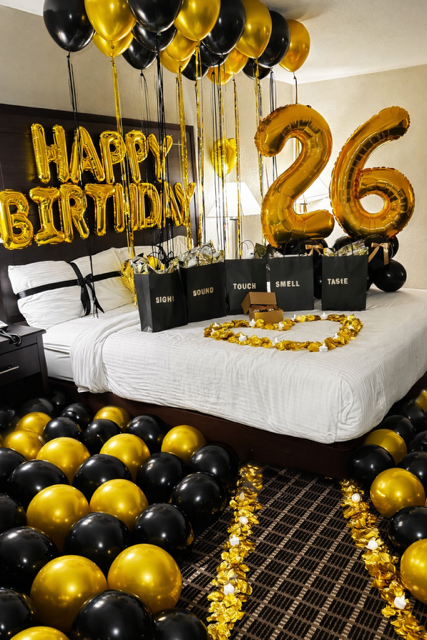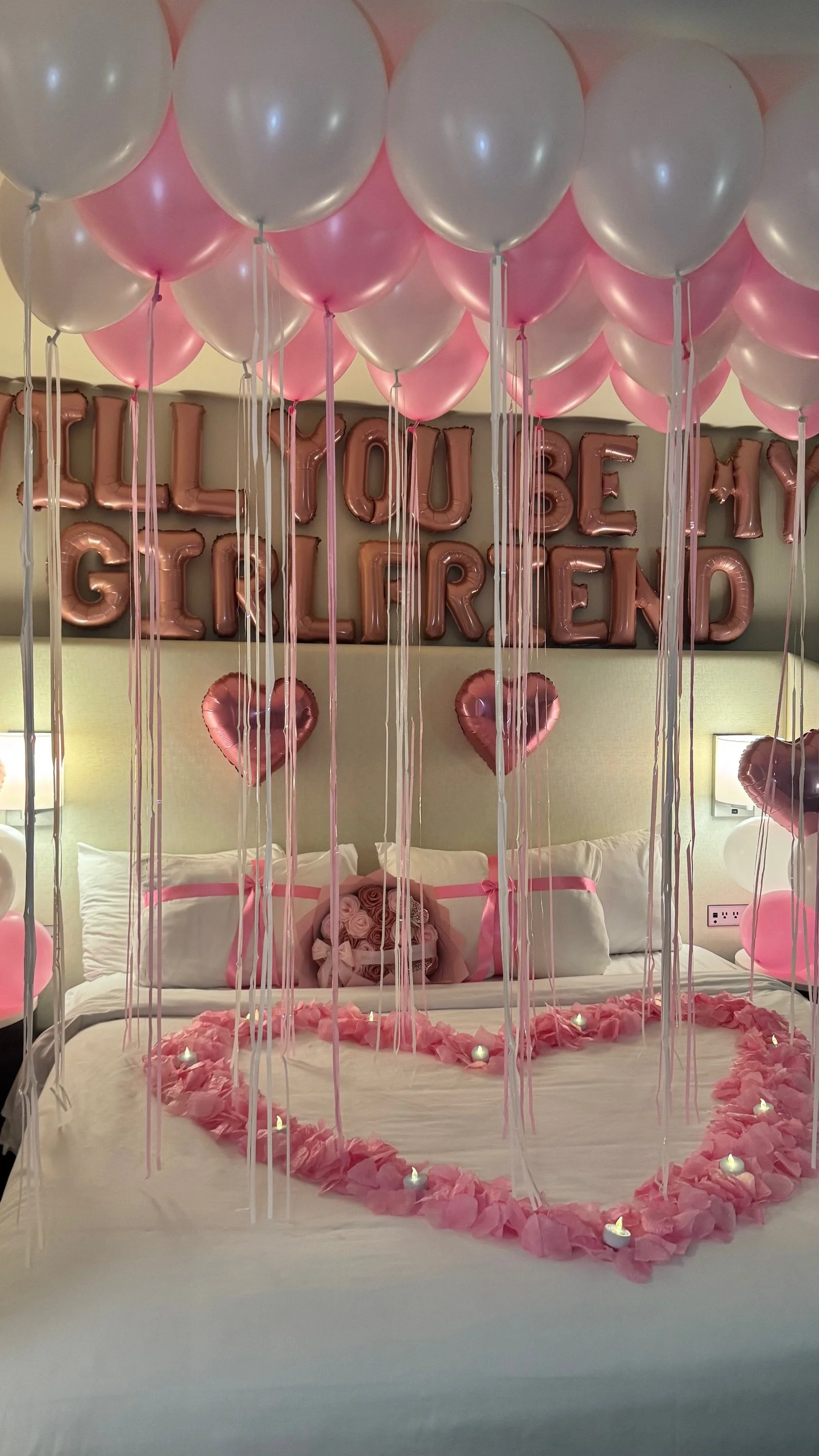 Beautifully curated luxury setup designed to create an intimate and elegant atmosphere. Personalized balloons set the tone for your celebration. A custom two-color palette flows throughout the space, complemented by ribbon-wrapped pillows and a romantic bed design featuring thousands of rose petals and soft tea-light candle accents.